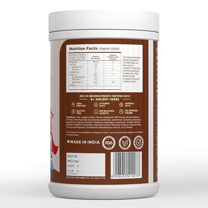 - Herbal Support: It contains a blend of ayurvedic herbs such as Ashwagandha, Satavari, Brahmi and Tulsi that provide additional health benefits. These herbs may support various aspects of children's health, including immune system function, and concentration. The herbal infusion adds an extra layer of support to promote overall wellness.