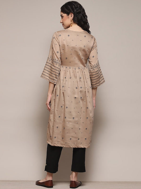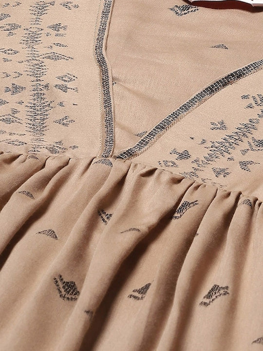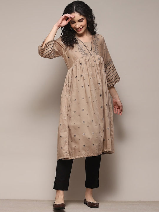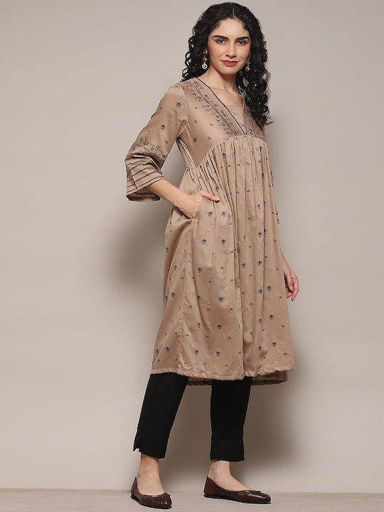 Product Details Colour: taupe-coloured & black Ethnic motifs woven design Anarkali shape Empire style V-neck Three-quarter, regular sleeves Calf length with flared hem Machine weave regular cotton Material & Care Cotton Dry...