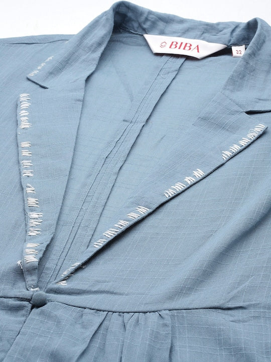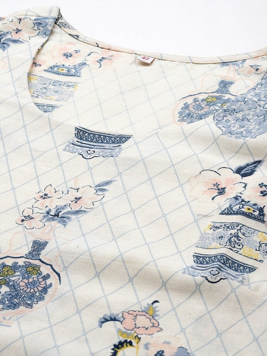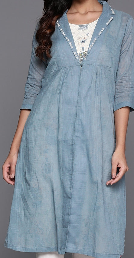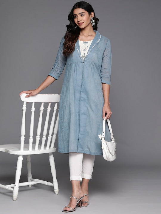 Kurta design details Colour: blue and white Floral printed Round neck Sleeveless, no sleeves Straight shape with regular style Calf length with straight hem Machine weave regular cotton-linen blend Comes with...