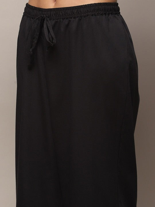 Product Details: Black printed Kurta with Palazzos with dupatta Kurta design: Floral printed Straight shape Regular style V-neck, three-quarter regular sleeves Calf length with straight hem Polyester knitted and woven fabric...