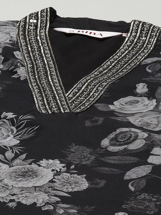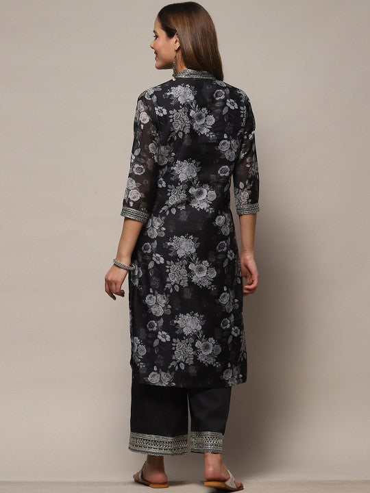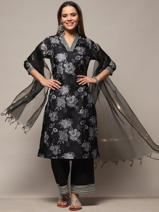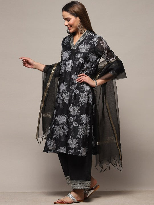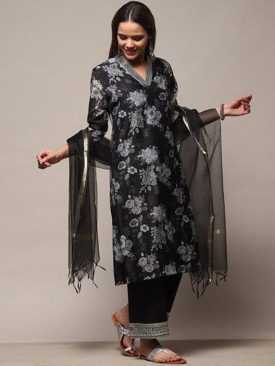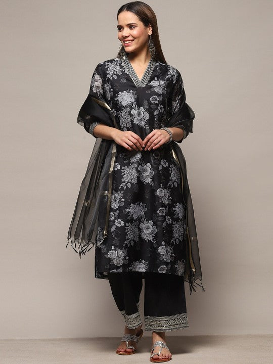 Biba Floral Printed Regular Kurta with Palazzos & Dupatta - Black