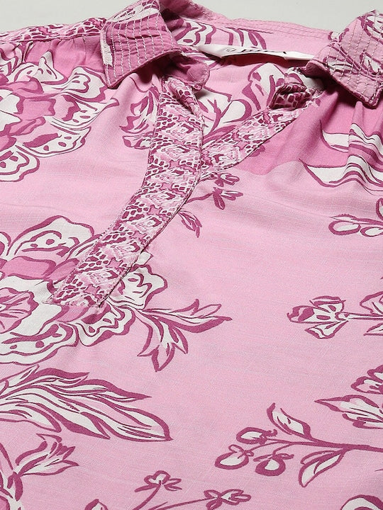 Biba Floral Printed Shirt Collar A-Line Kurti - Pink