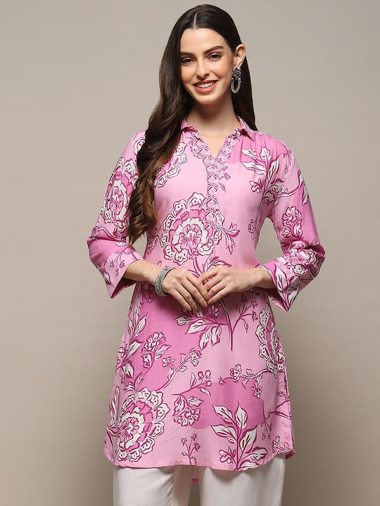 Product Details Pink, white kurti Floral printed A-Line shape, regular style Shirt collar, three-quarter, regular sleeves Machine Weave viscose rayon Material & Care Viscose Rayon Hand Wash