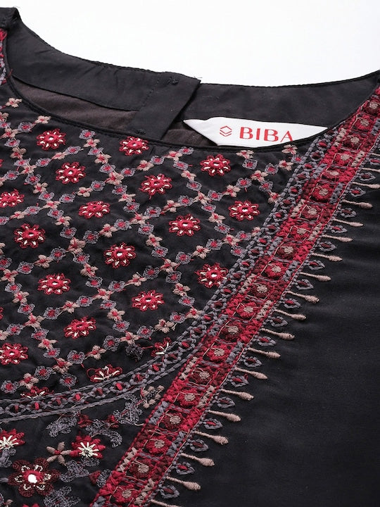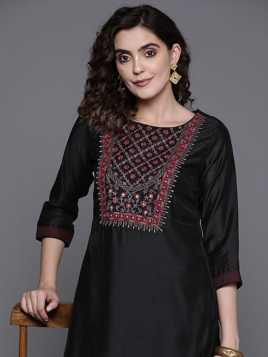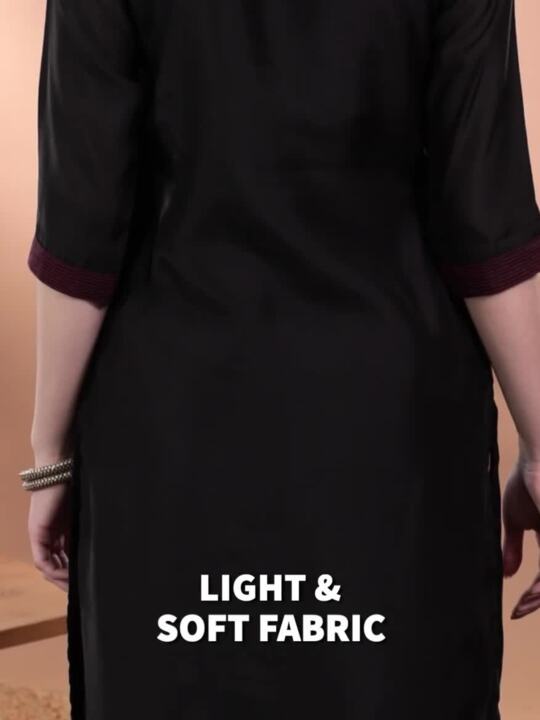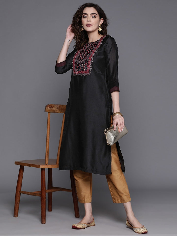 Product Details Colour: black Floral yoke design Round neck Three-quarter, regular sleeves Straight shape with regular style 2 pockets Calf length with straight hem Machine weave regular chanderi cotton Material &...