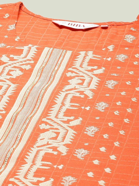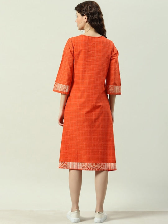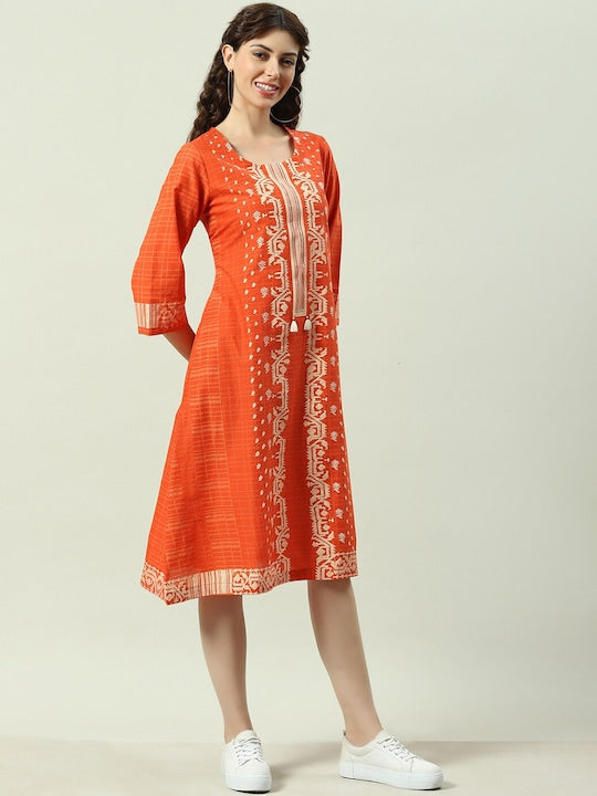 Product Details Colour: orange & cream Geometric printed Round neck Three-quarter, regular sleeves A-line shape with regular style Knee length with flared hem Knitted and woven regular cotton Material & Care...
