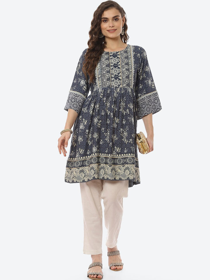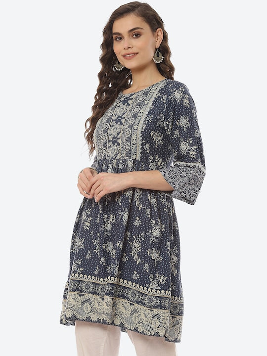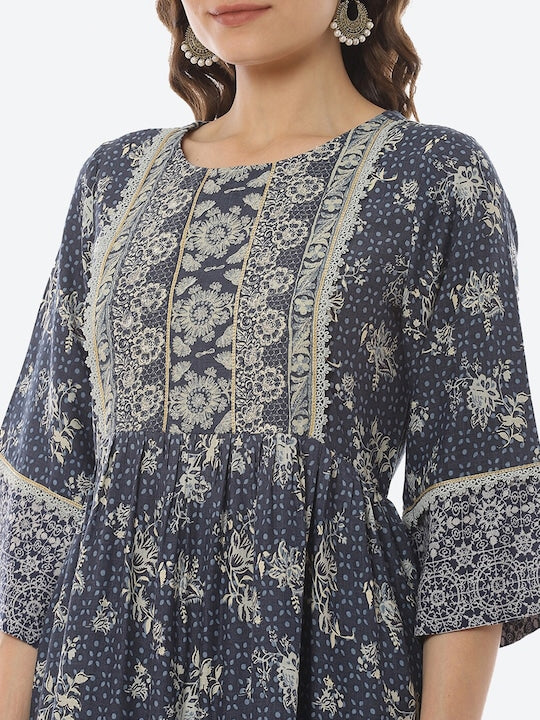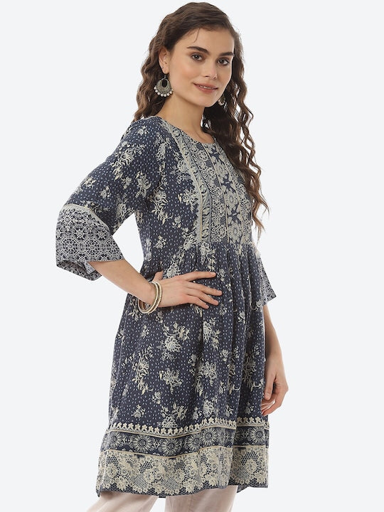 Biba Navy Blue Ethnic Motifs Printed Pleated Anarkali Kurti