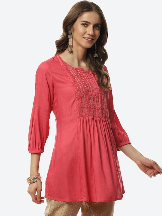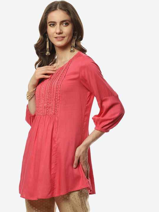 Product Details Pink a-line kurti Solid yoke design Round neck, three-quarter, regular sleeves Sequinned detail Machine weave regular viscose rayon Material & Care Viscose Rayon Hand wash