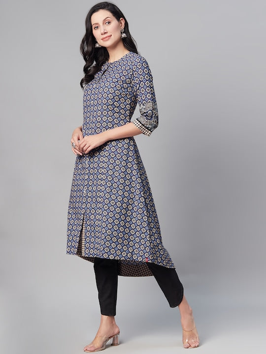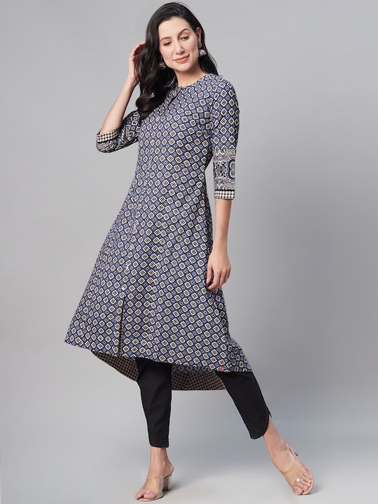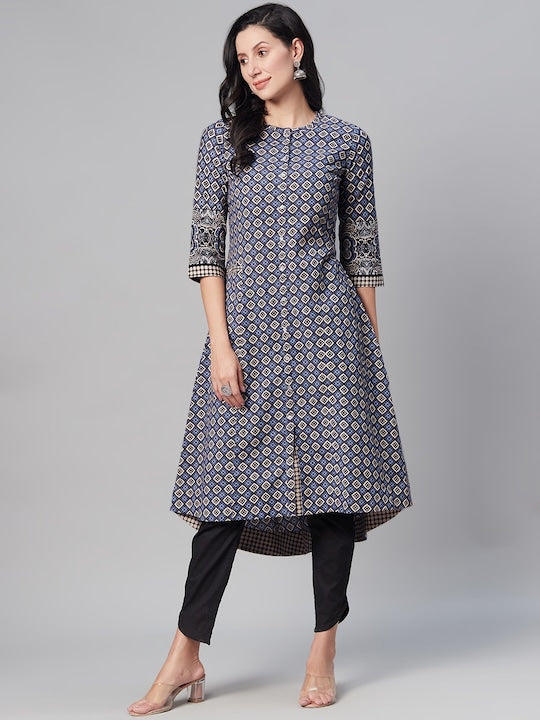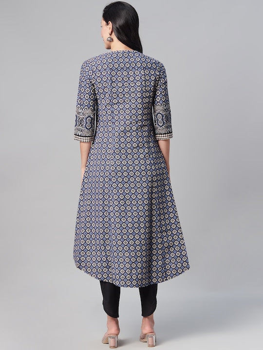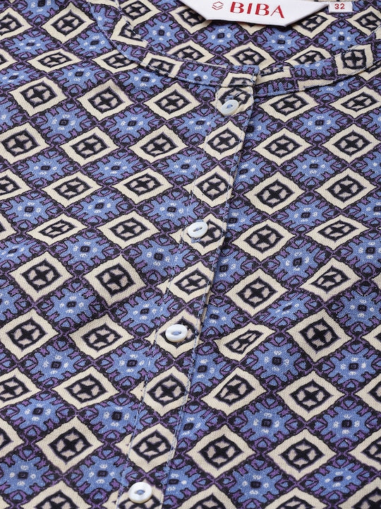 Biba Women Blue & Off White Geometric Printed Kurta