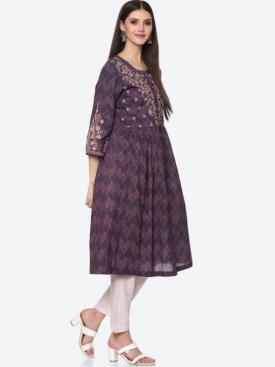 Product Details Colour: blue and pink Floral embroidered Round neck Three-quarter, regular sleeves A-line shape with regular style Calf length with flared hem Machine weave regular cotton Material & Care Cotton...
