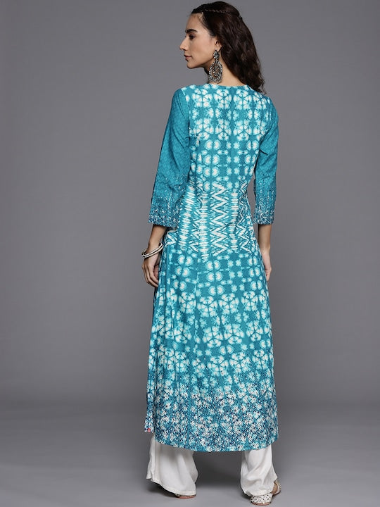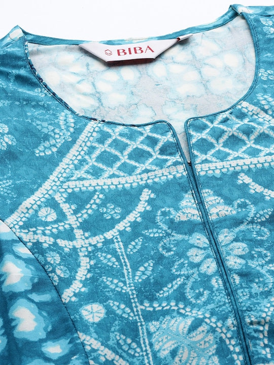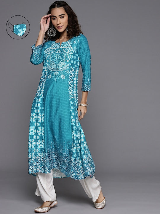 Biba Women Blue & White Ethnic Motifs Printed Kurta & Mask