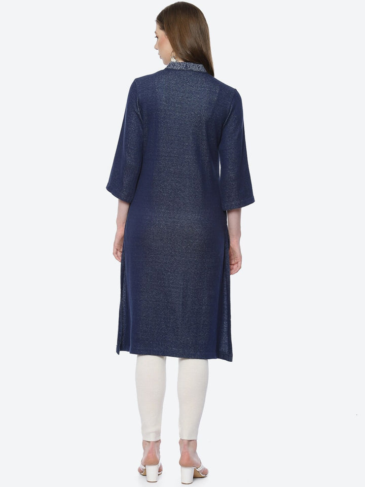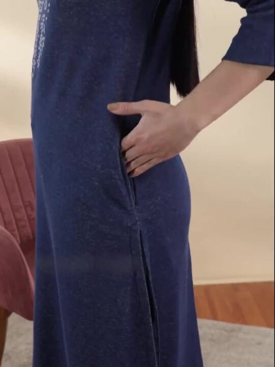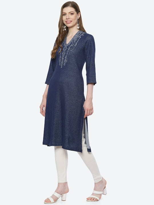 Product Details Colour: blue and white Solid yoke design V-neck Three-quarter, regular sleeves Straight shape with regular style Thread work detail Knee length with straight hem Machine weave regular polyester Material...