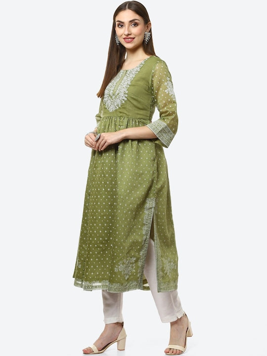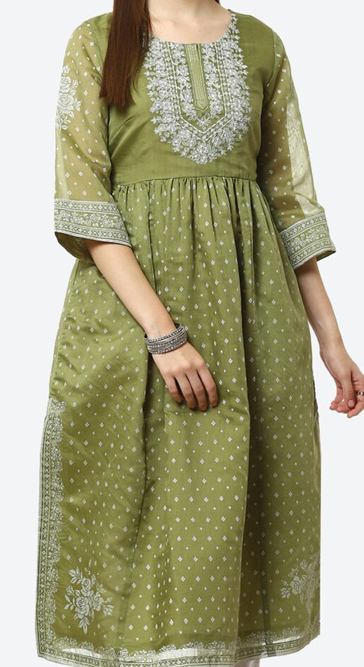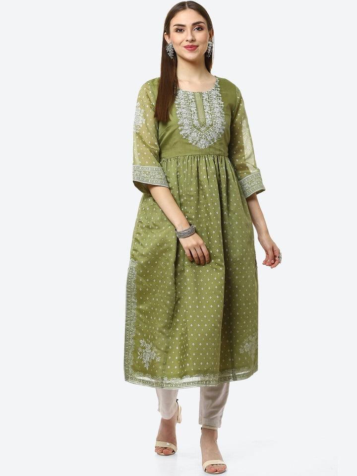 Product Details Colour: green Ethnic motifs printed Round neck Three-quarter, flared sleeves Anarkali shape with pleated style Thread work detail Calf length with flared hem Machine weave regular polyester Material &...