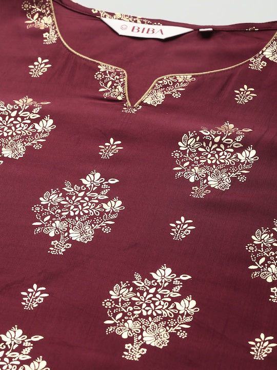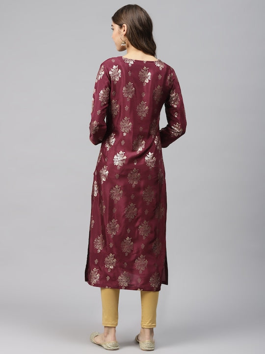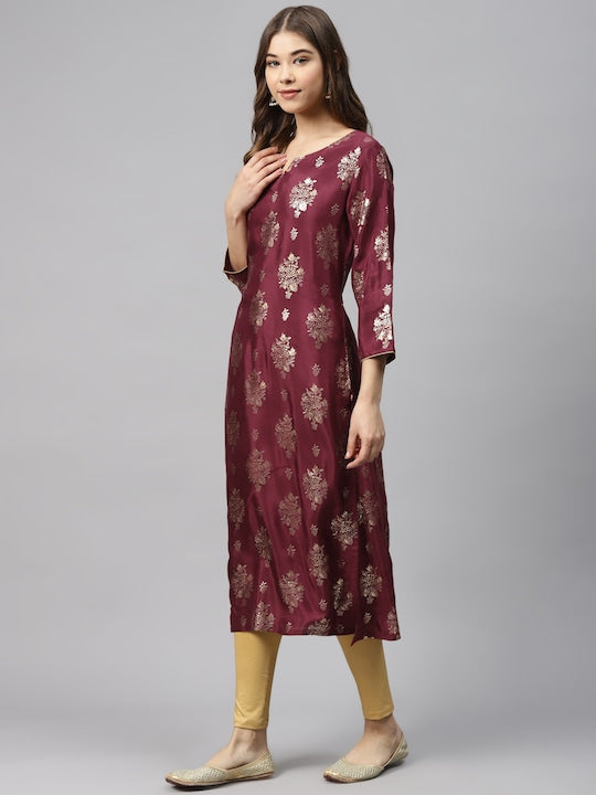 - Maroon and golden printed straight kurta, has a round neck, three-quarter sleeves, straight hem, and side slits
