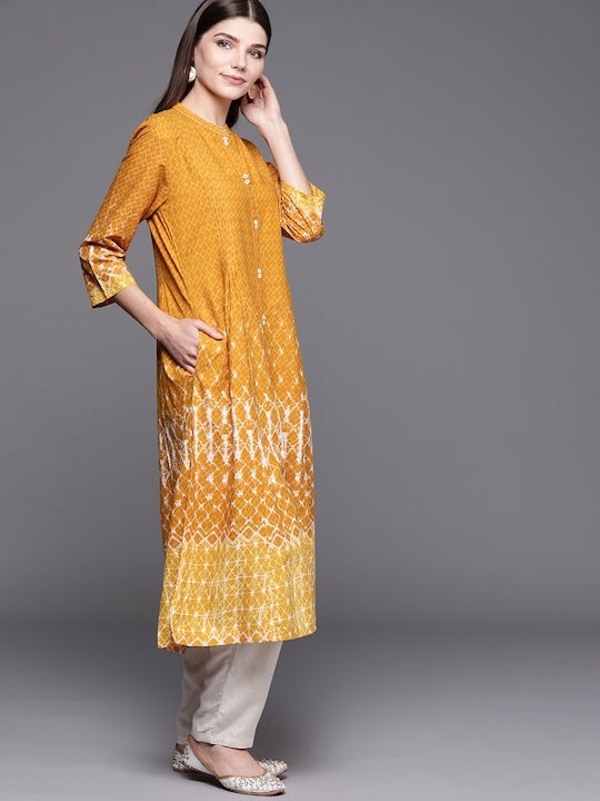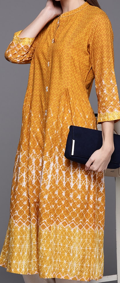 Product Details Colour: mustard yellow and white Geometric dyed Mandarin collar Three-quarter, regular sleeves Gathered and pleated detail A-line shape with regular style Calf length with flared hem Machine weave regular...