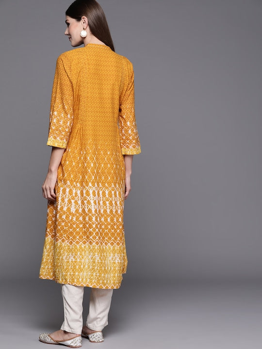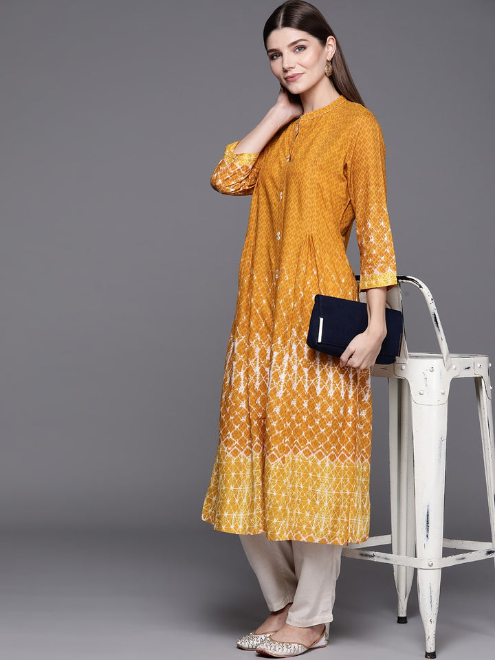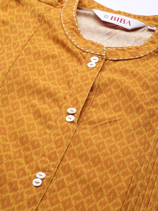Biba Women Mustard Yellow & White Geometric Dyed Gathered A-line Kurta with Mask