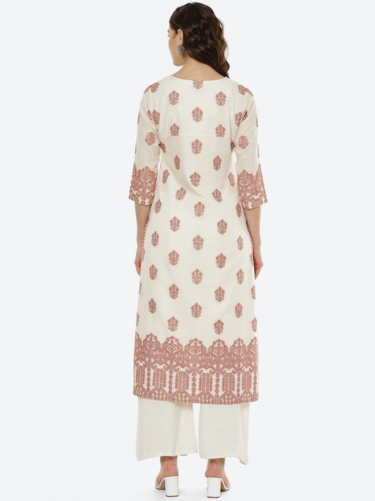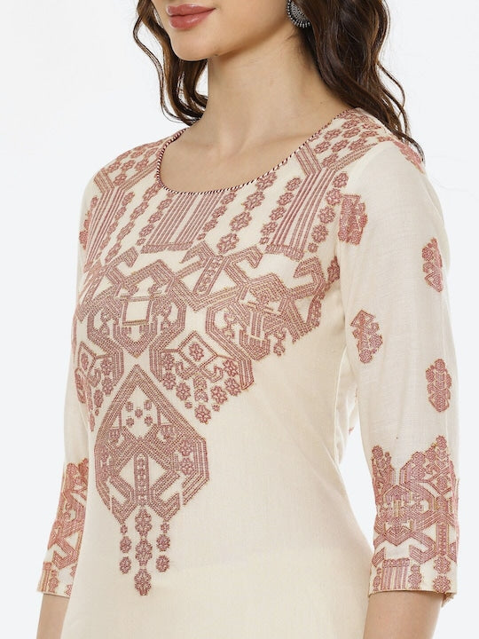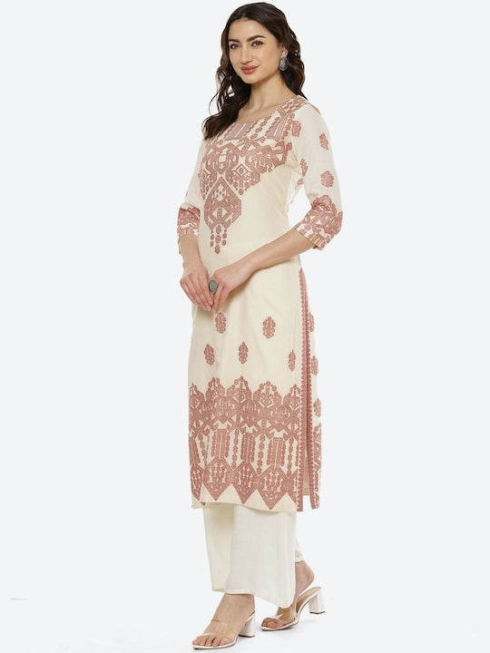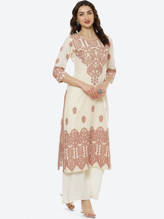 Product Details Colour: off white Ethnic motifs printed Square neck Three-quarter, regular sleeves Anarkali shape with regular style Mirror work detail Calf length with flared hem Machine weave jacquard Material &...