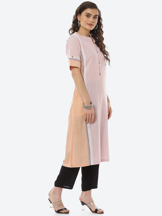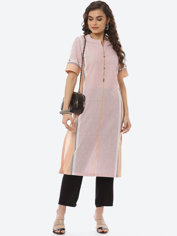 Biba Women Peach-Coloured Striped Thread Work Kurta