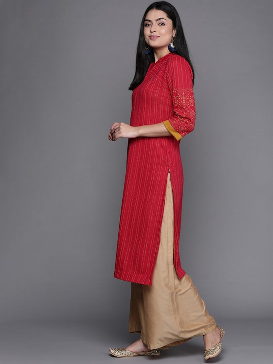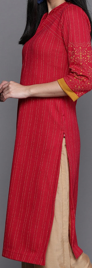 Product Details Colour: red and golden Striped Mandarin collar Three-quarter sleeves Side slits Straight shape with regular style Calf length with straight hem Knitted regular cotton Material & Care Cotton, polyester...