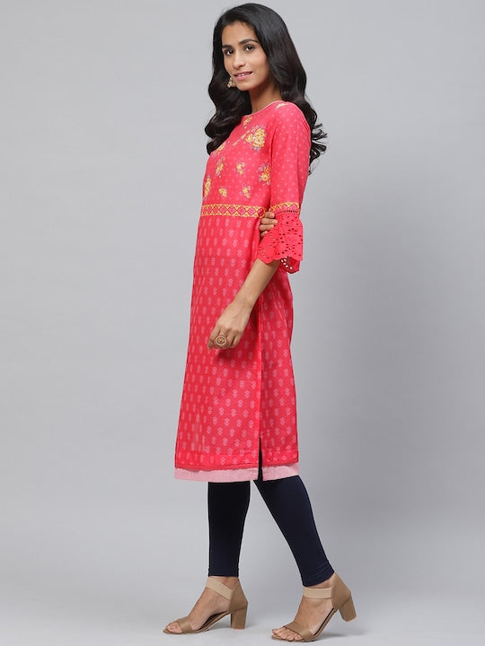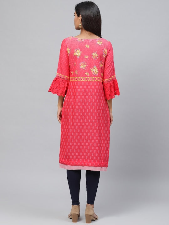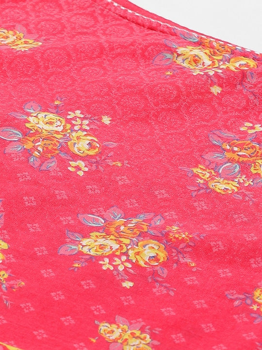 Biba Women Pink & Yellow Floral Detail Ethnic Printed Straight Kurta