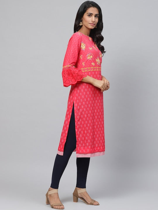 - Pink and Yellow floral detail ethnic printed straight kurta, has a round neck, three-quarter sleeves with schiffli embroidered detail, straight hem, and side slits