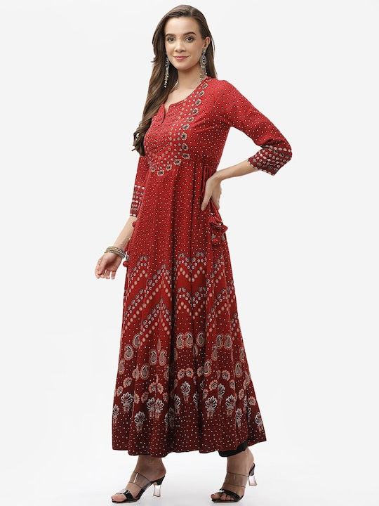 Product Details Colour: red Ethnic motifs embroidered Round neck Long, regular sleeves Anarkali shape with empire style Mirror work detail Ankle length with flared hem Machine weave regular viscose rayon Material...