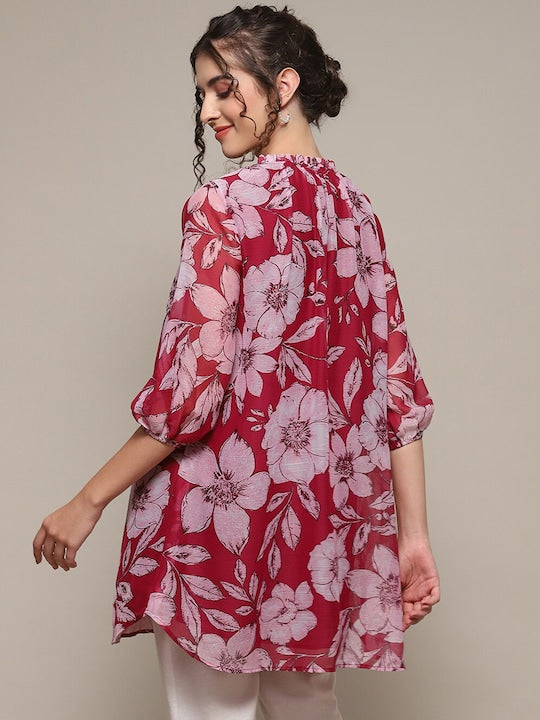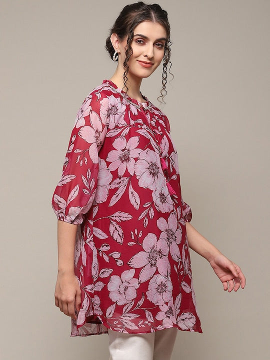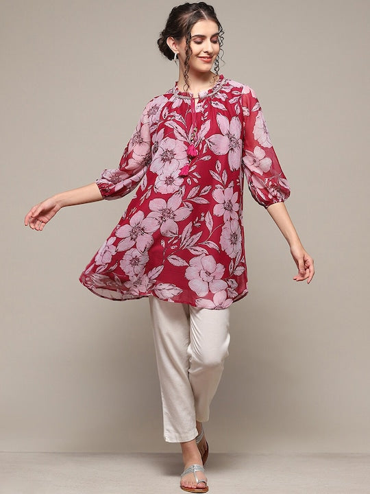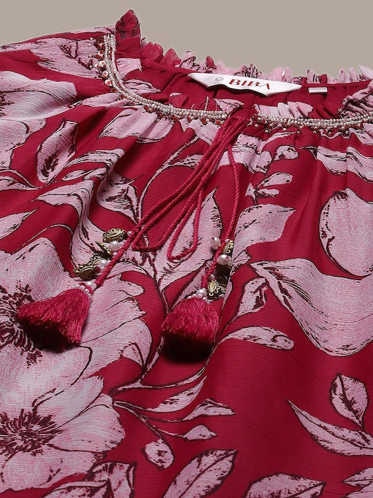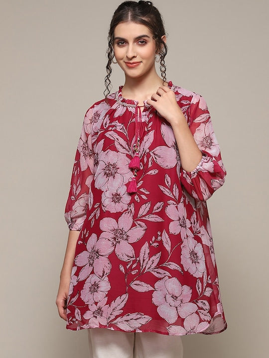 Product Details Red and pink floral print kurti Floral printed Round neck Three-quarter, puffed sleeves A-line shape beads and stones detail Above knee with flared hem Machine weave regular polyester Material...