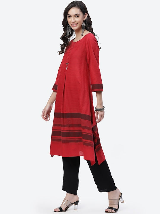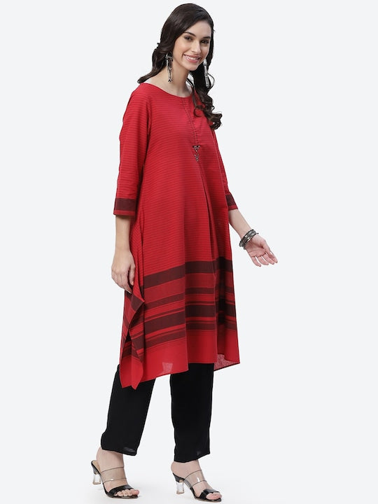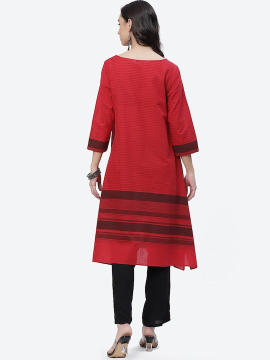 Product Details Colour: red Embellished striped Round neck Three-quarter, regular sleeves A-line shape with regular style Thread work detail Calf length with straight hem Machine weave regular cotton Material & Care...