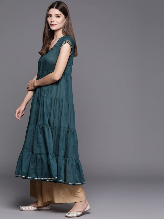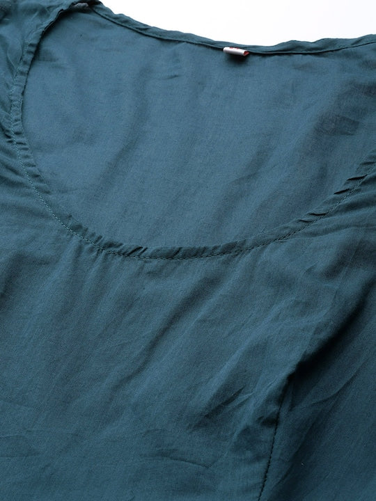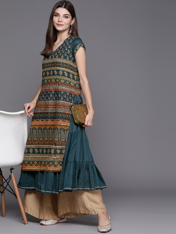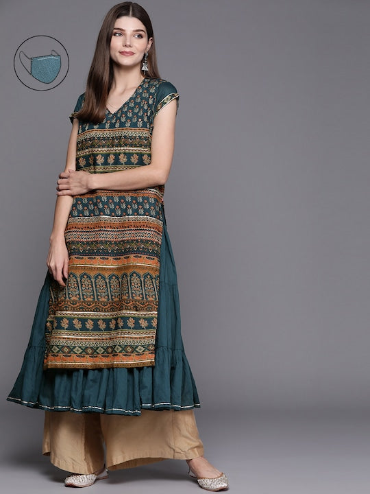 Biba Women Teal Ethnic Motifs Printed Kurta with Mask