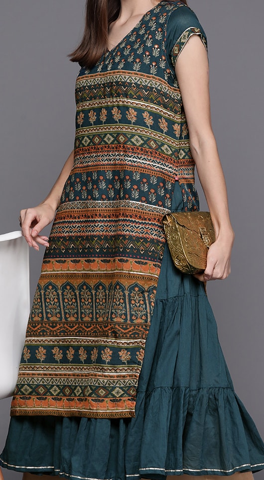 Product Details Colour: teal Ethnic motifs printed V-neck Short, cap sleeves Straight shape with regular style Calf length with straight hem Machine weave regular polyester Material & Care Polyester Hand wash...