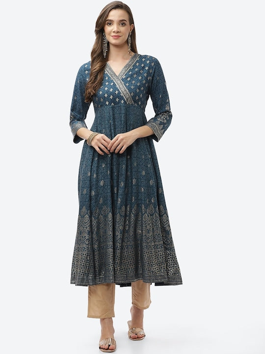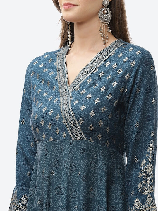 Product Details Colour: teal and silver-toned Ethnic motifs printed V-neck Three-quarter, regular sleeves Anarkali shape with angrakha style Thread work detail Calf length with flared hem Machine weave regular viscose rayon...