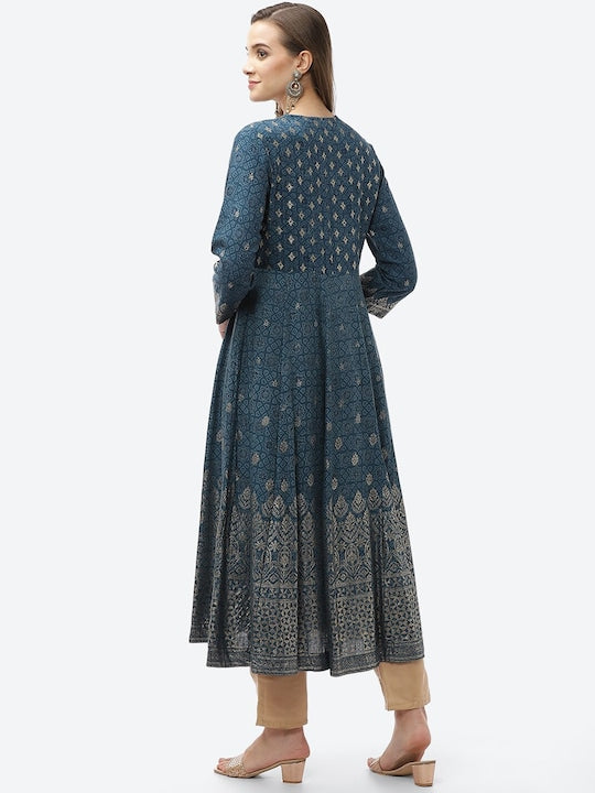 Biba Women Teal & Silver-Toned Ethnic Motifs Printed Thread Work Anarkali Kurta