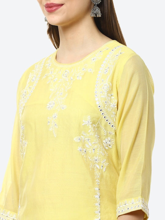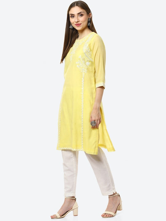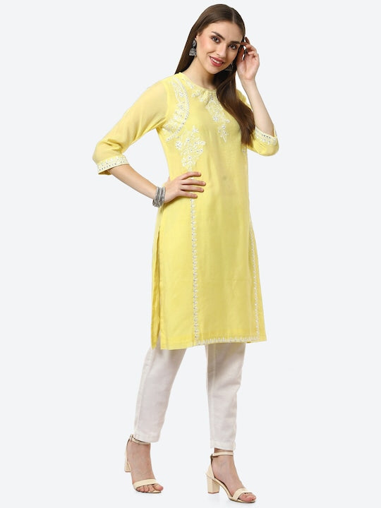 Product Details Colour: yellow Ethnic motifs embroidered Round neck Three-quarter, regular sleeves Straight shape with regular style Chikankari detail Knee length with straight hem Machine weave regular polyester Material & Care...