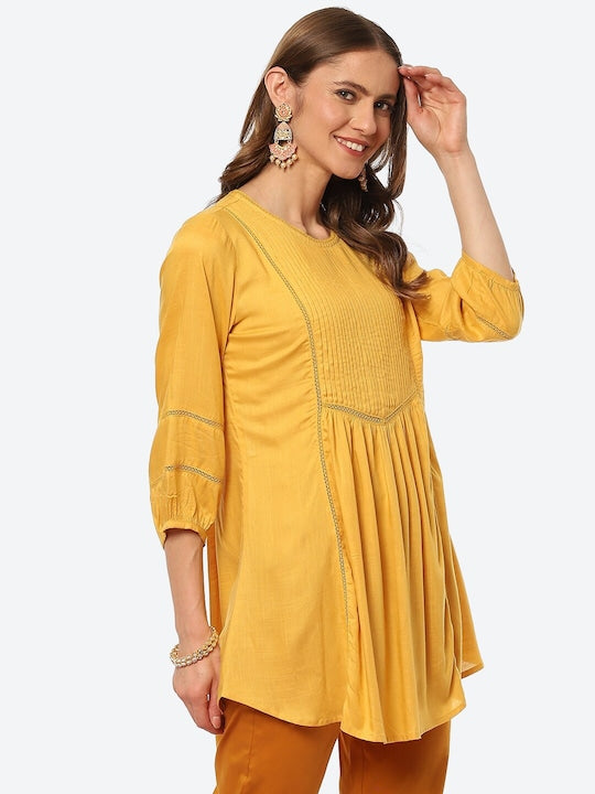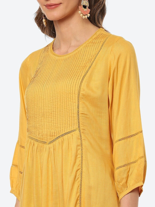 Biba Women Yellow Pleated And Panelled Puff Sleeves Kurti