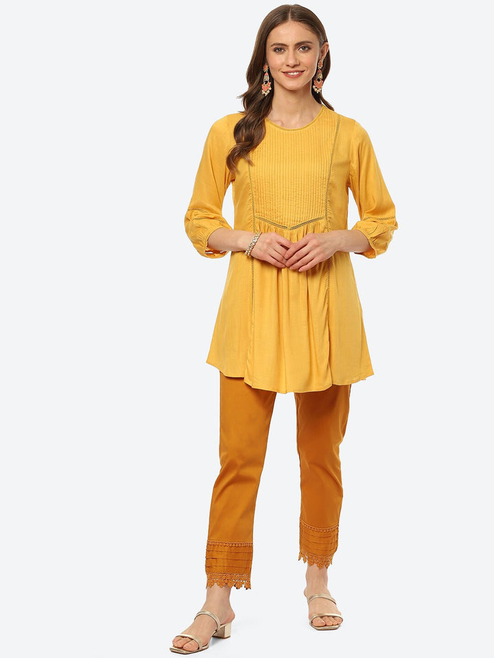 Product Details Colour: yellow Solid Round neck Long, regular sleeves A-line shape Panelled and pleated style Above knee with flared hem Machine weave regular viscose rayon Material & Care Viscose Rayon...