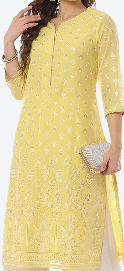 Product Details Colour: yellow Ethnic motifs printed Round collar Three-quarter, regular sleeves Straight shape with regular style Calf length with straight hem Machine weave regular polyester Material & Care Polyester Hand...