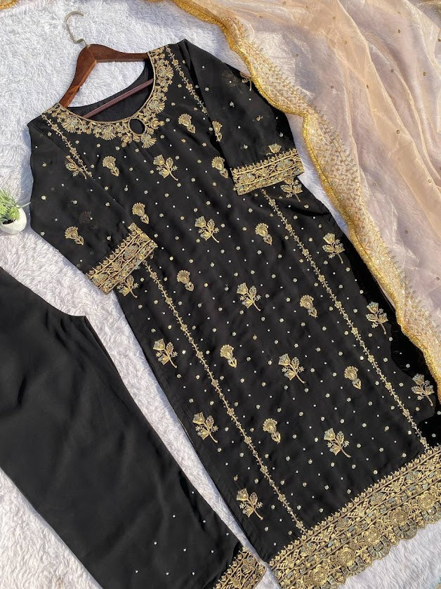 Black Fox Georgette Embroidered Suit Set with Moti & Sequin Detailing Luxe Party Wear