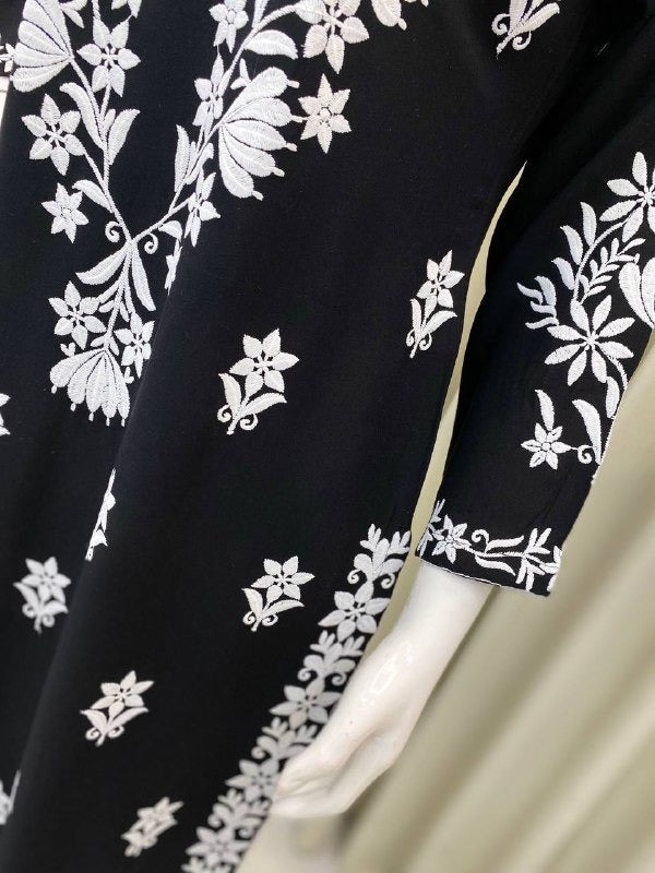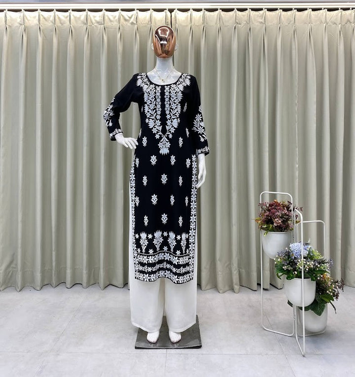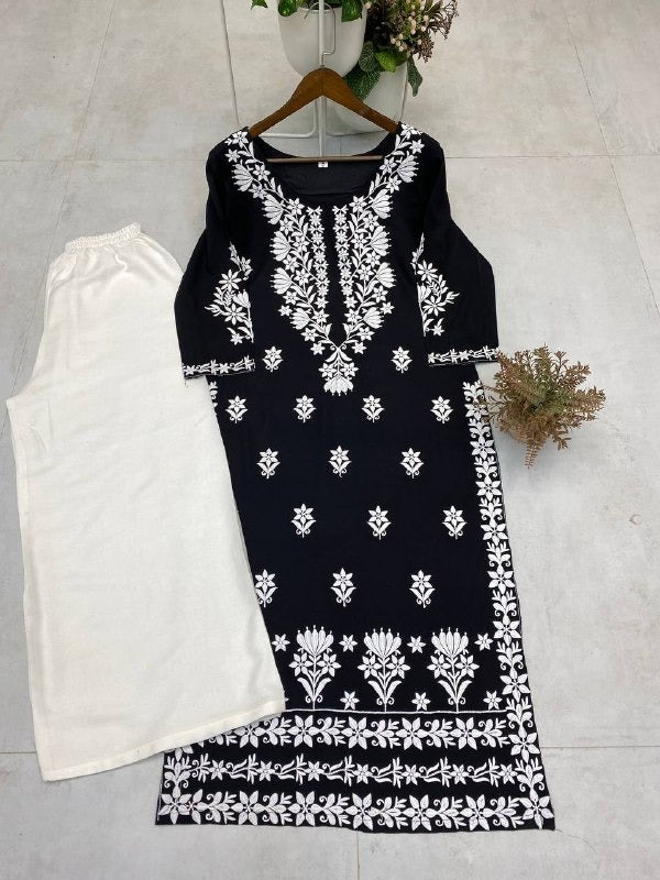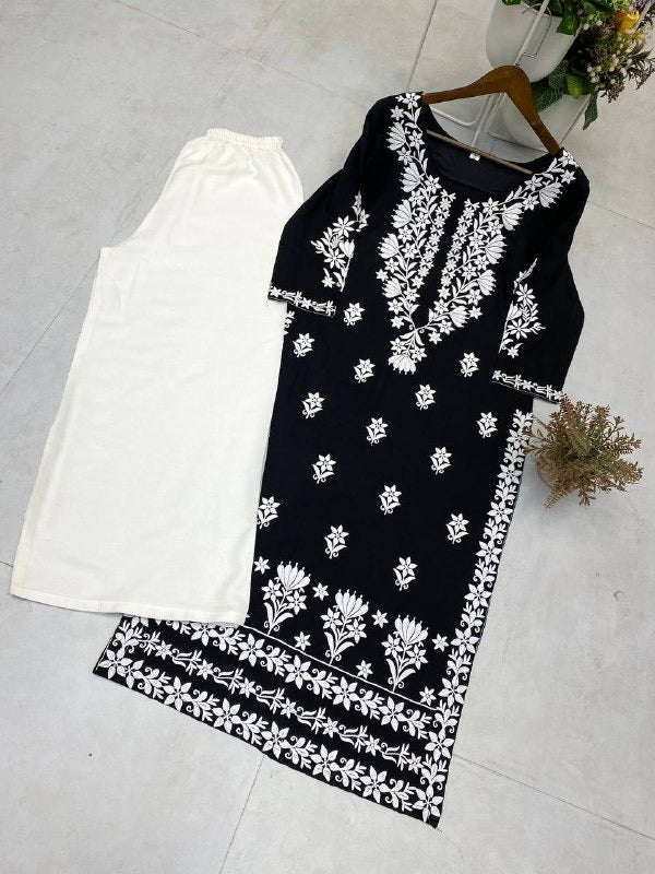 Black & White Embroidered Straight Kurta Set Elegant Cotton Kurti with White Palazzo