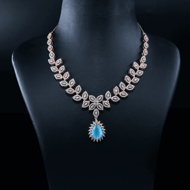 - CZ Real Diamond Look Handmade Exclusive Rose Gold Short Necklace Set with Real CZ Stones and Sky Blue Stones.