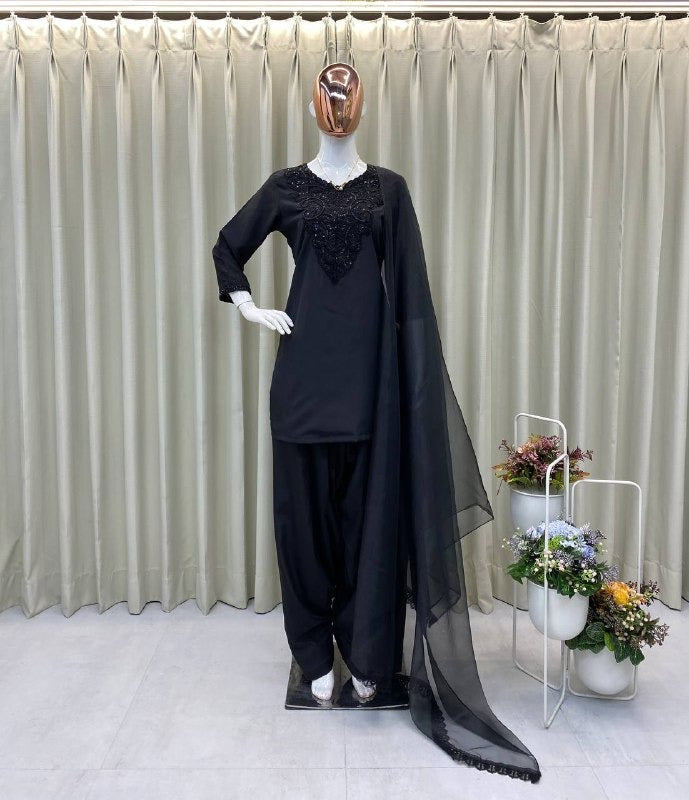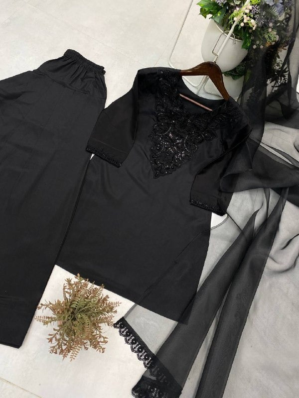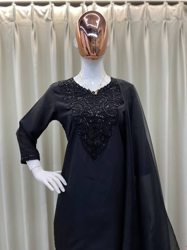 Elegant Black Embroidered Kurta Set with Sheer Dupatta Timeless Ethnic Ensemble