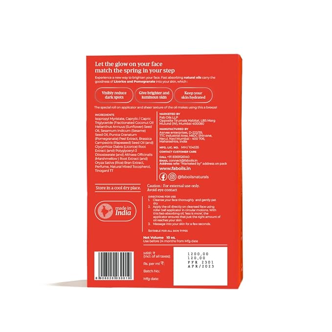 - Clinically Proven Effective: With a combination of self-testing, dermatologist-testing and clinical instrumental-testing, the Fab Oils range is proven to work! In 4 weeks of regular application 88% users felt dark-spots have visibly reduced, 94% showed improved radiance and glow as ceritifed by a dermatologist and it was instrumentally proven (by a tewameter) that skin hydration was improved by 64%!