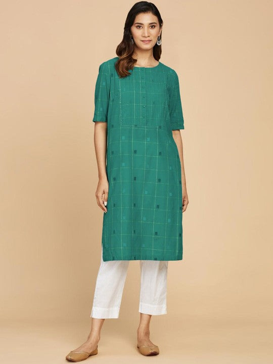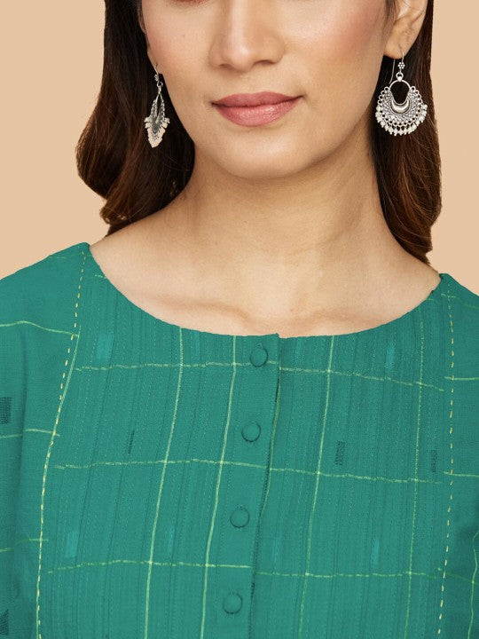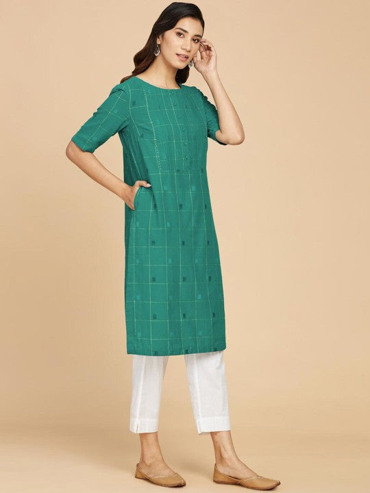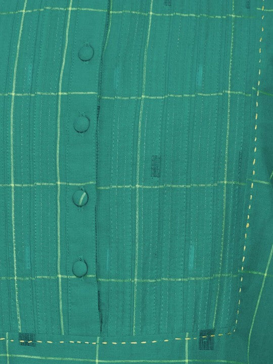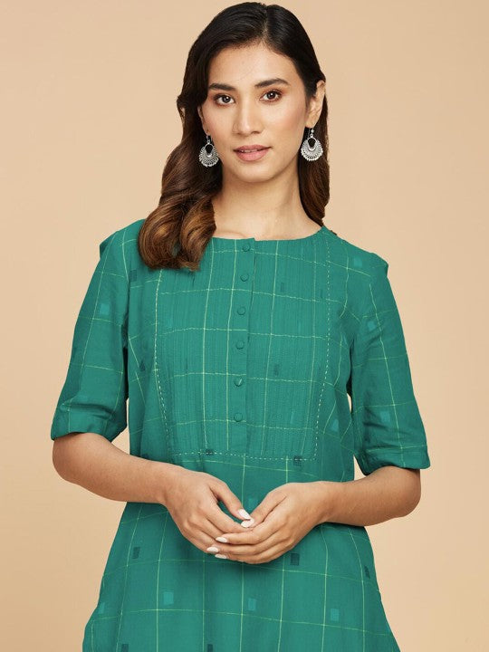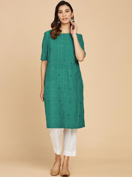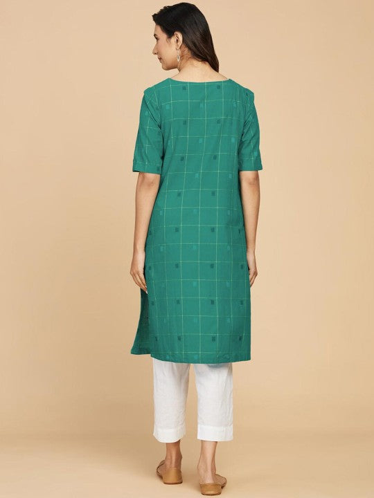 Product Details: Colour: Green & White Geometric woven design Boat neck Short, regular sleeves Straight shape with regular style Calf Length with straight hem Machine weave regular cotton Material & Care:...