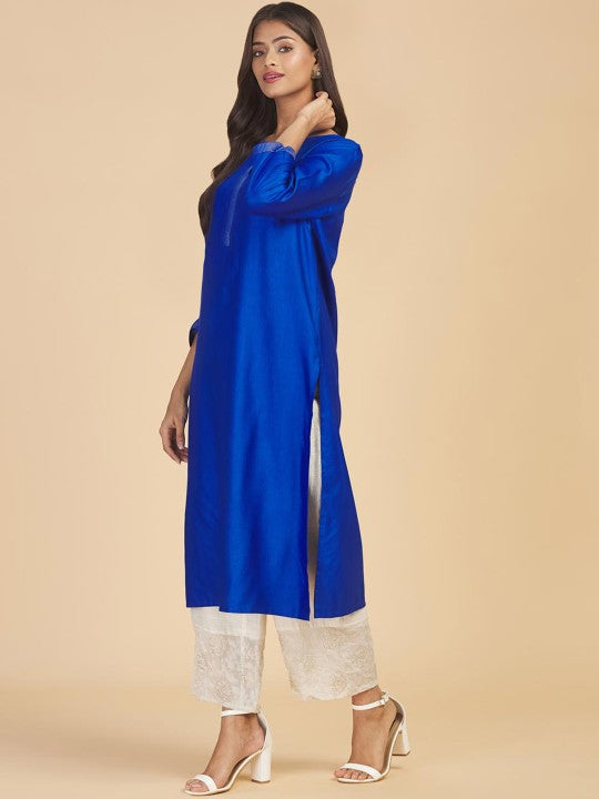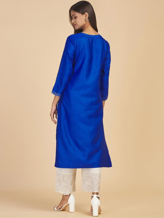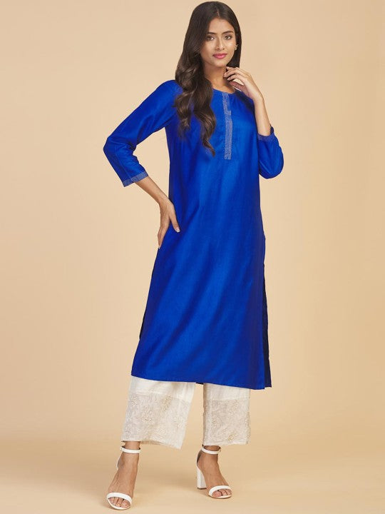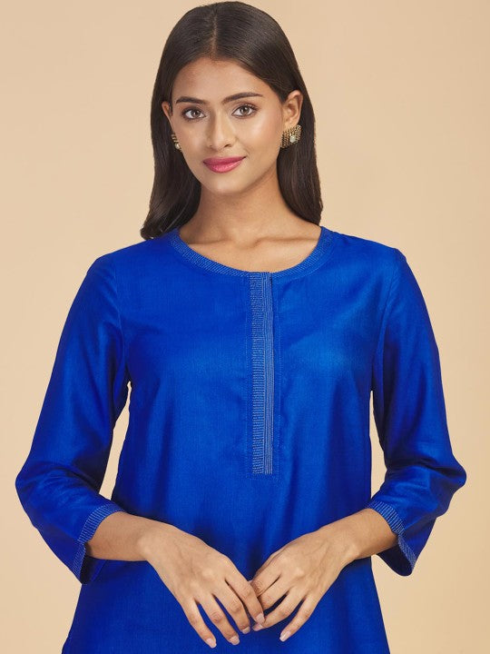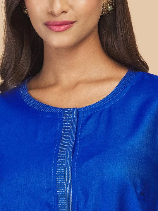 Product Details: Colour: Blue Solid solid Round neck Short, regular sleeves Straight shape with regular style Calf length with straight hem Knitted and woven regular viscose rayon Material & Care: Viscose...