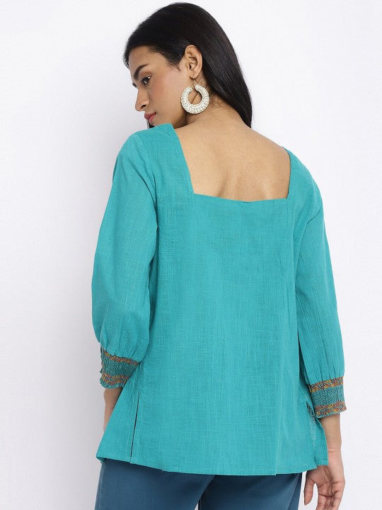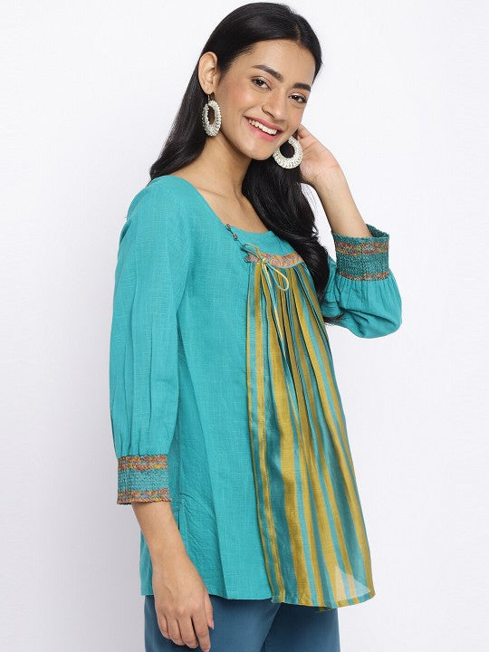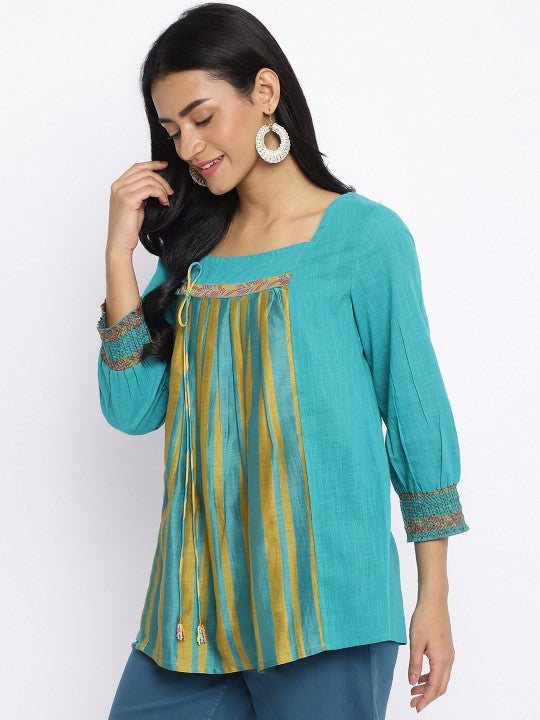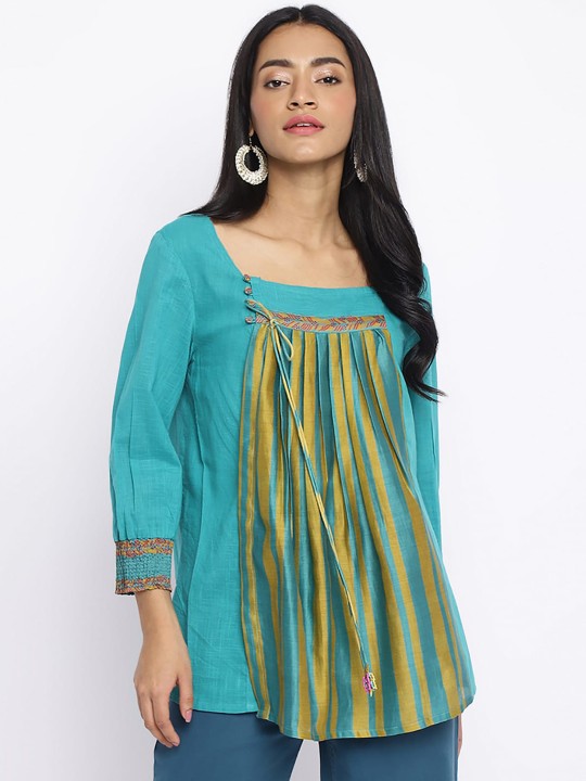 Fabindia Square Neck Pleated Striped Cotton Kurti - Turquoise Blue & Gold