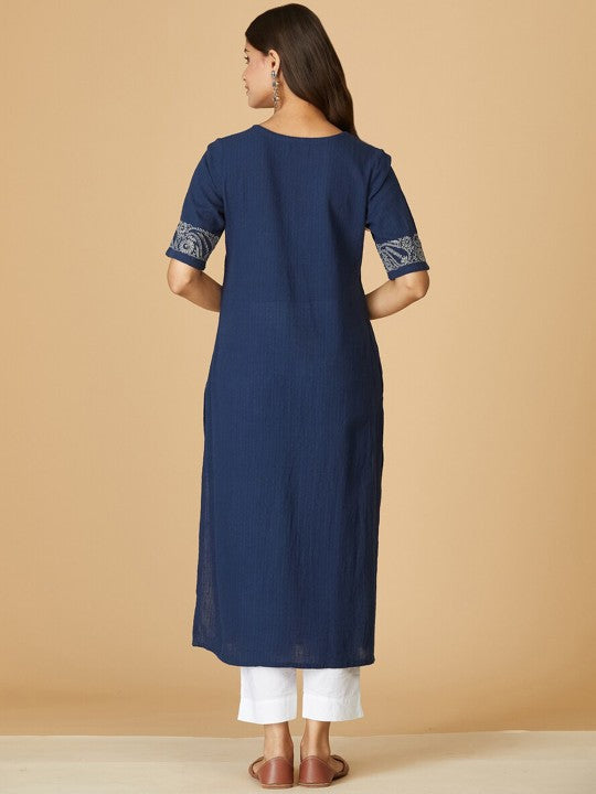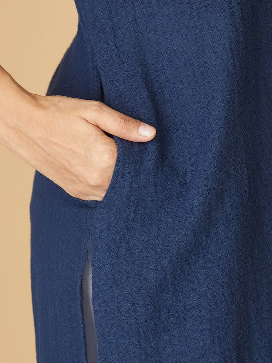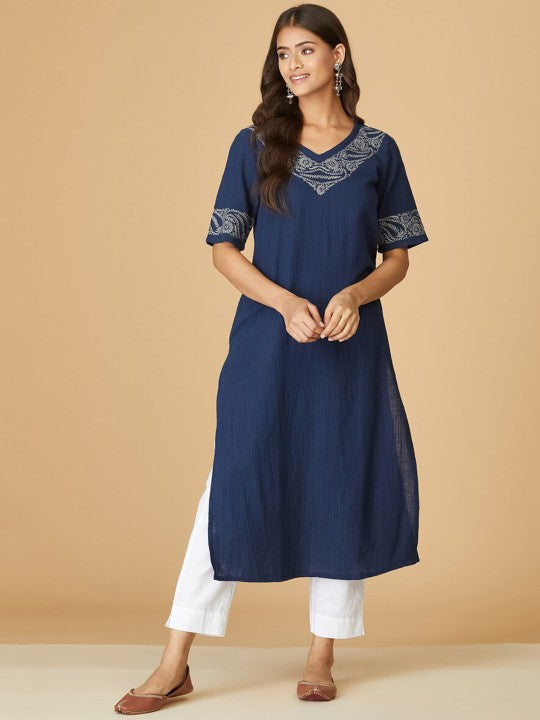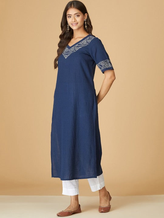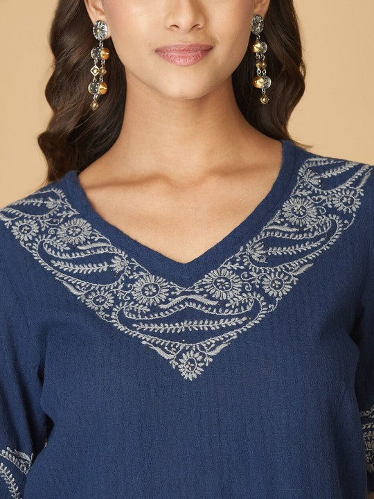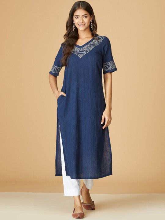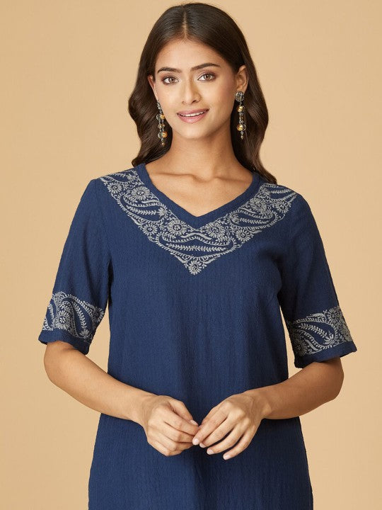 Product Details: Colour: Navy Blue Solid V-neck Short, regular sleeves Straight shape with regular style Thread work detail Ankle length with straight hem Knitted and woven regular cotton Material & Care:...