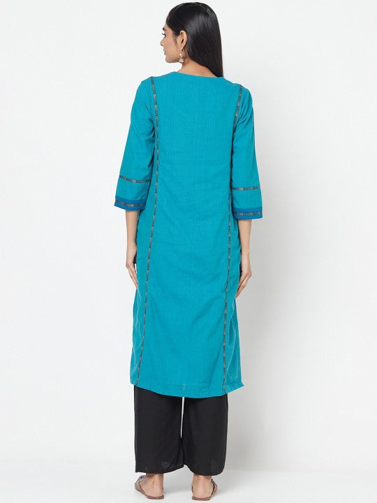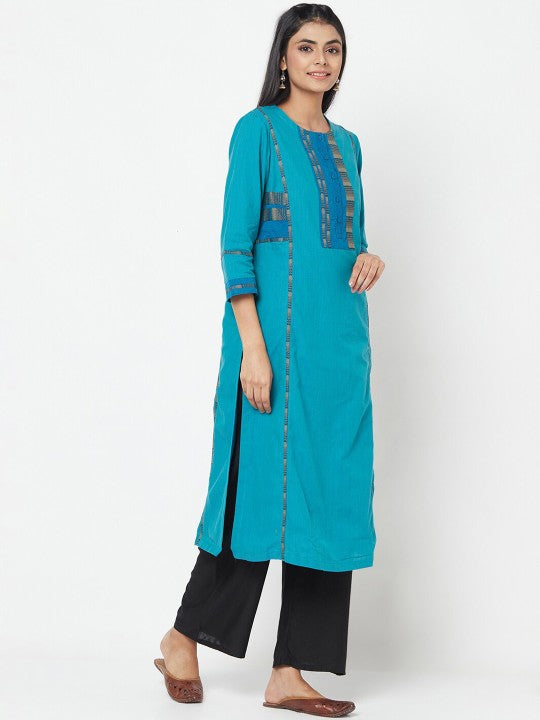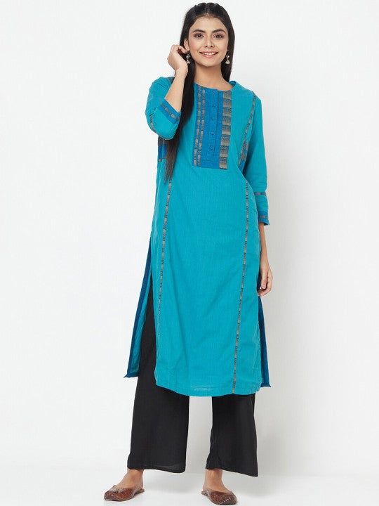 Product Details: Colour: Blue Geometric yoke design Round neck Three-quarter, regular sleeves Straight shape with panelled style Calf length with straight hem Knitted and woven regular cotton Material & Care: Cotton...