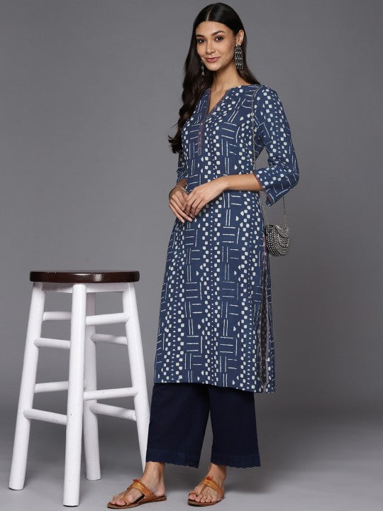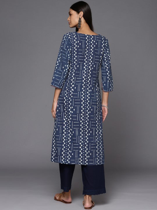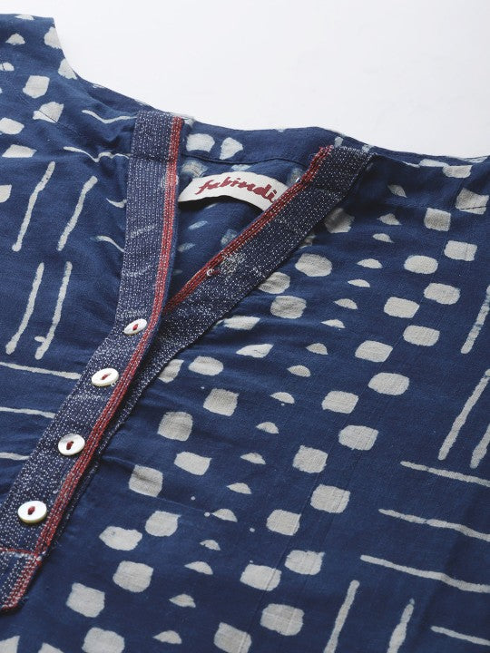 Fabindia Women Blue & White Geometric Printed Block Print Pure Cotton Kurta