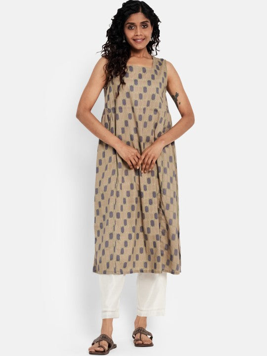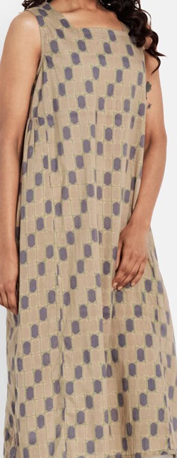 Product Details: Colour: brown Ethnic motifs printed Boat neck Sleeveless, no sleeves A-line shape with pleated style Knee length with flared hem Knitted and woven regular cotton Material & Care: Cotton...