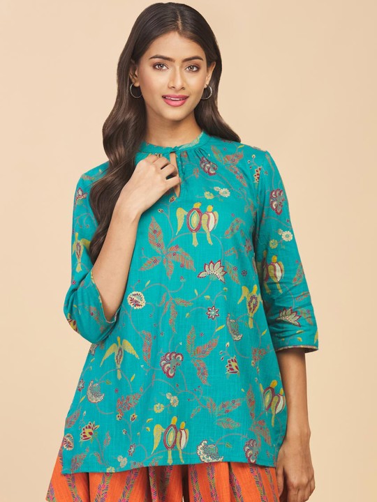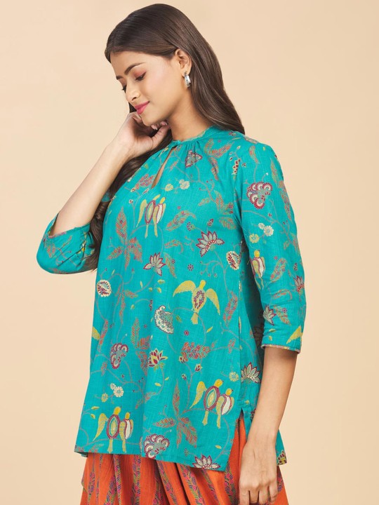Product Details: A-line kurti Floral printed Mandarin collar, three-quarter, regular sleeves Knitted and woven regular pure cotton Material & Care: Pure Cotton Hand Wash