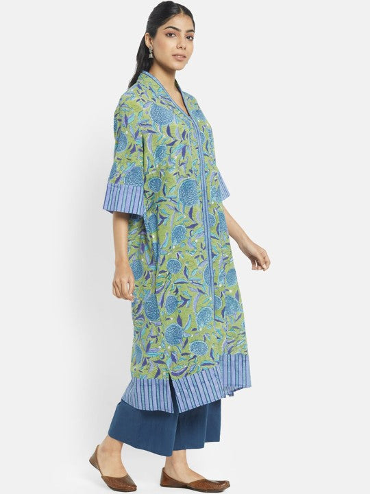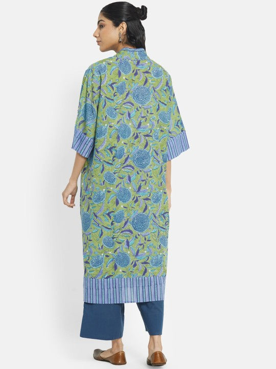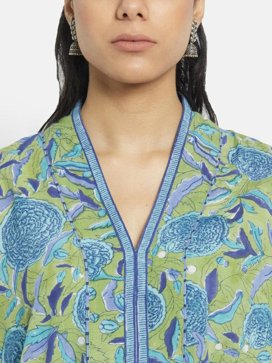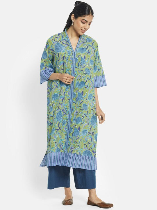 Fabindia Women Green Cotton Floral Printed Regular Fit A-Line Kurta