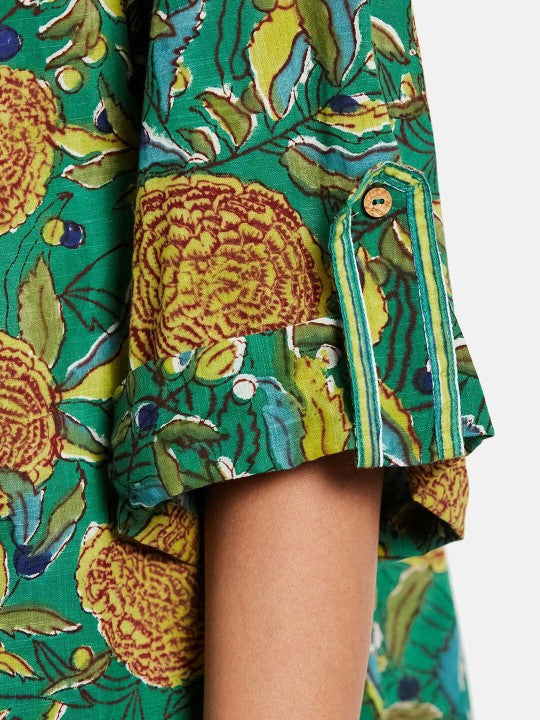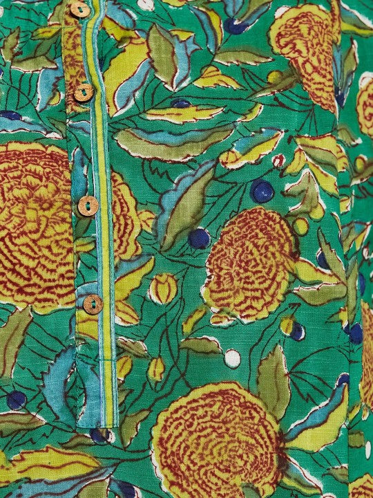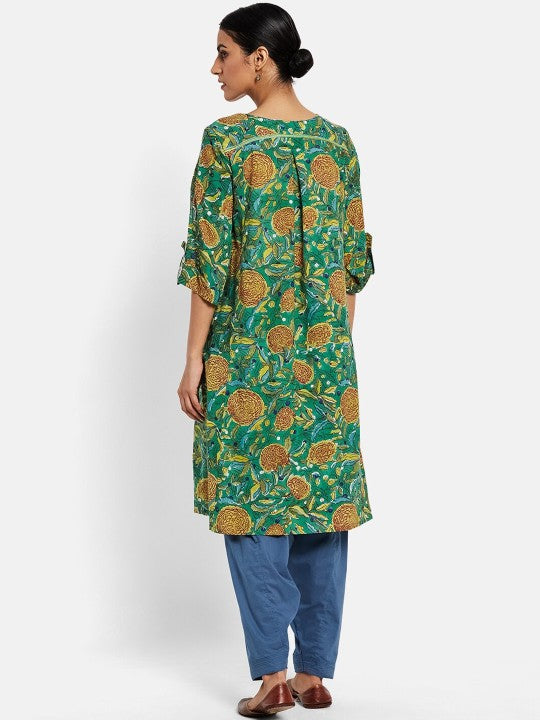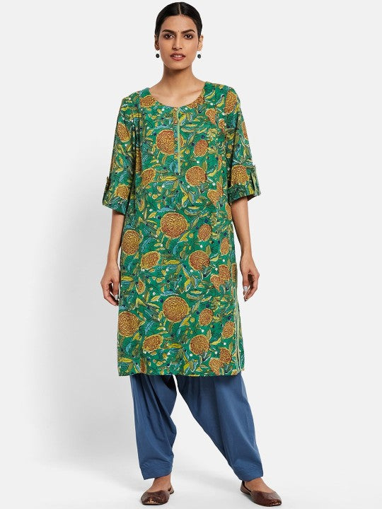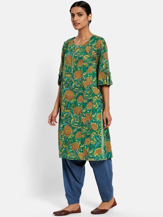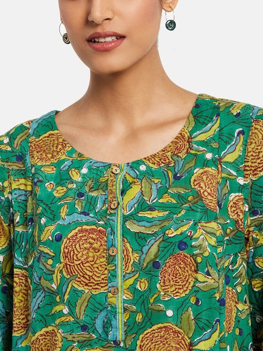 Product Details: Colour: Green Floral printed Round neck Three-quarter, roll-up sleeves A-line shape with regular style Knee length with straight hem Knitted and woven regular cotton Material & Care: Cotton Hand...